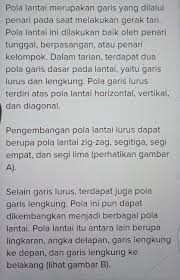 Maybe you would like to learn more about one of these? Sebutkan tiga contoh pola lantai gerak tari berpasangan yang merupakan pengembangan pola lantai gerak lurus. Check spelling or type a new query. We did not find results for: